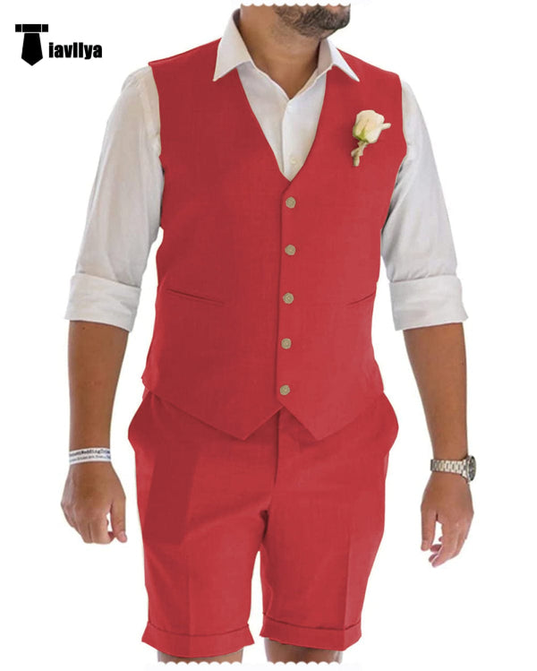 • Tiavllya Casual 2 Piece Men's Suit Flat Linen Notch Lapel Tuxedos (Vest+Shorts)