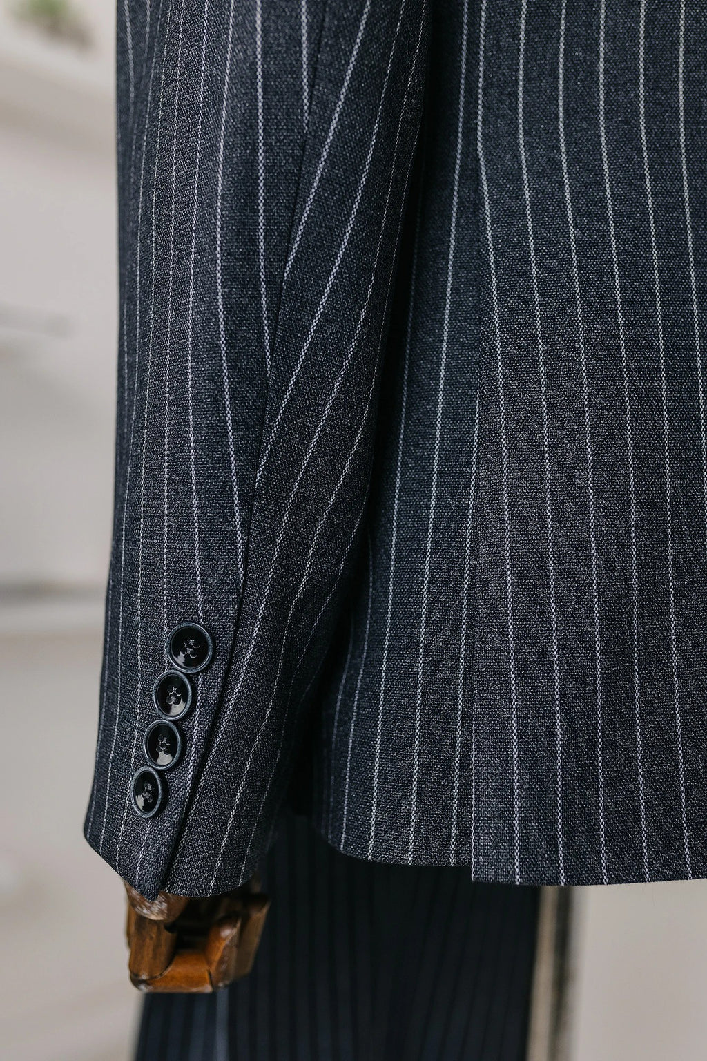 The suit jacket adopts a classic notch lapel design with a single row of two buttons, which is simple yet stable. The back center slit cut makes the movement more flexible and comfortable. The jacket has two flap pockets, a chest patch pocket and an inner pocket to meet daily storage needs. The four-button cuff slit design shows exquisite details, and the overall full lining makes it smoother and closer to the body.