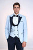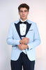 The matching vest comes with a sharp shawl lapel, double-breasted front with five buttons, two real bound pockets, and a metal elastic adjustment buckle at the back for a custom fit.